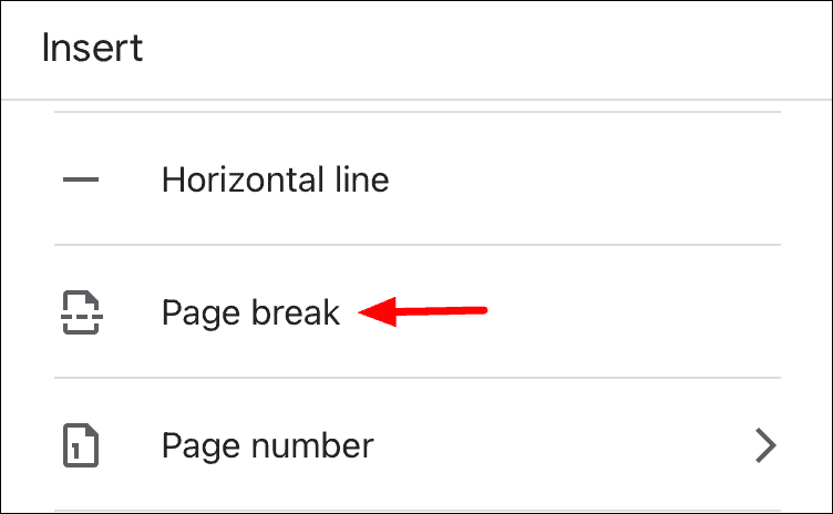 Step 3: From the menu that appears at the bottom, scroll down if necessary and tap on Page break. This will insert a new page in your document at the cursor's position.