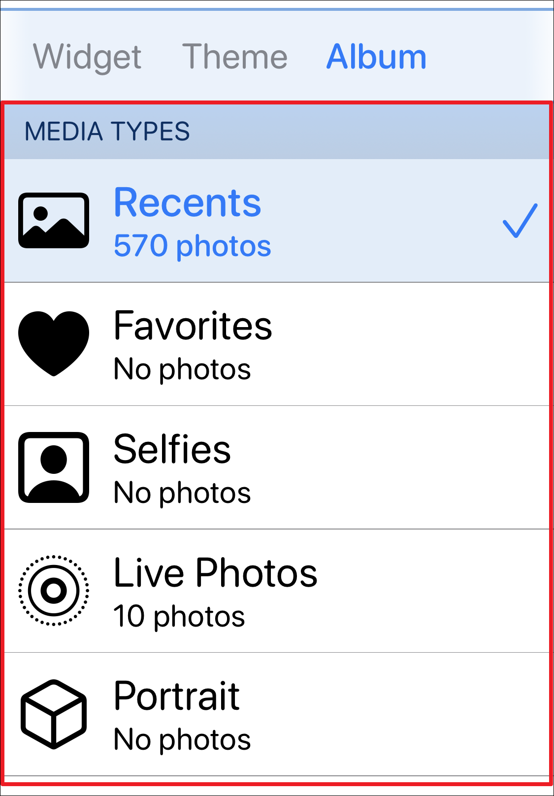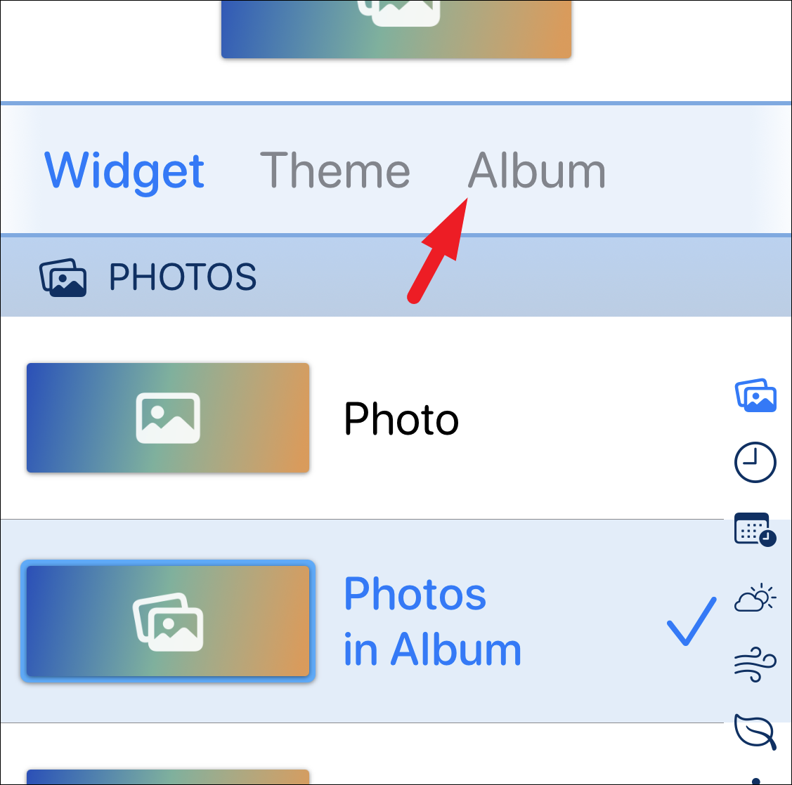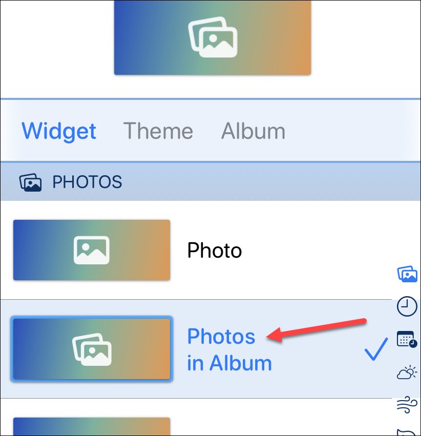 In case you wish to display a slideshow, tap on the ‘Photos in Album’ option in the Widget tab.