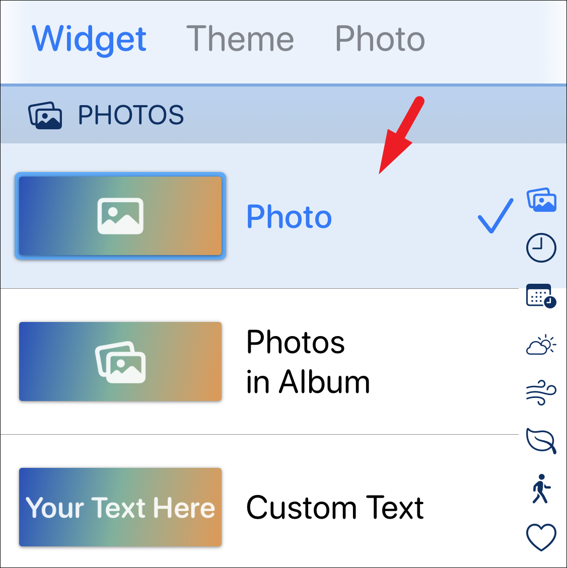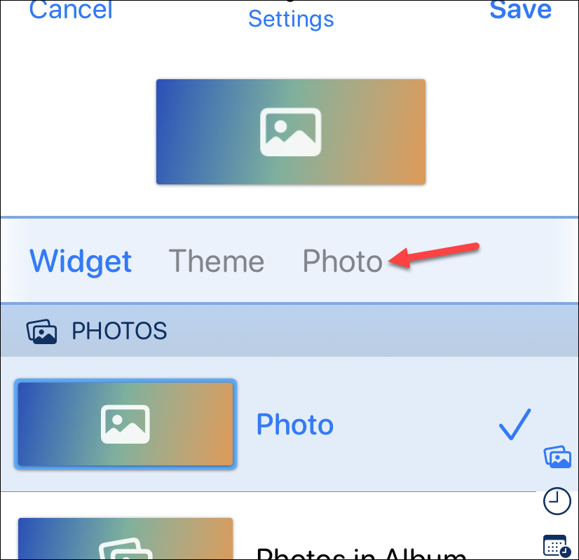 Now, tap on the ‘Photo’ option if you only wish to display a single photo in the widget. If you want to add a slideshow, move on to the instructions ahead.