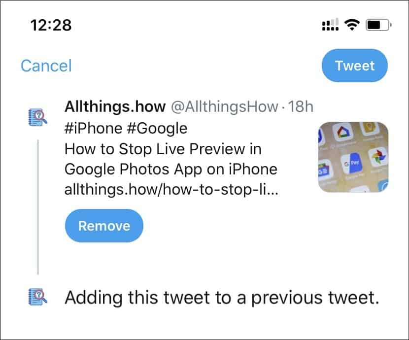 Once you select an old tweet, it’ll display on the screen and then you can continue composing your new tweet that is to be added to the selected one.