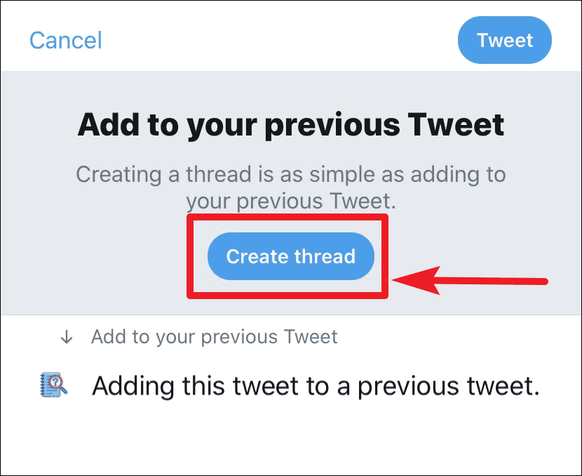 Here’s how you can do it. In the Twitter app, start composing a Tweet. Then pull down on the screen to add the tweet to a previous tweet. The option to Create Thread will be displayed on the screen after you pull down. Tap on it.