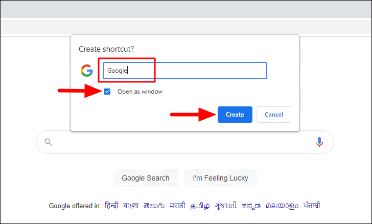 The ‘Create shortcut’ dialog box will now appear. The shortcut will by default be named as the webpage. You have the option to modify the name by entering a new one in the text box. Next, if you want the shortcut to open in a new window, instead of as a tab in the existing window, select the checkbox for ‘Open as window’. Finally, click on ‘Create’ to complete the process.