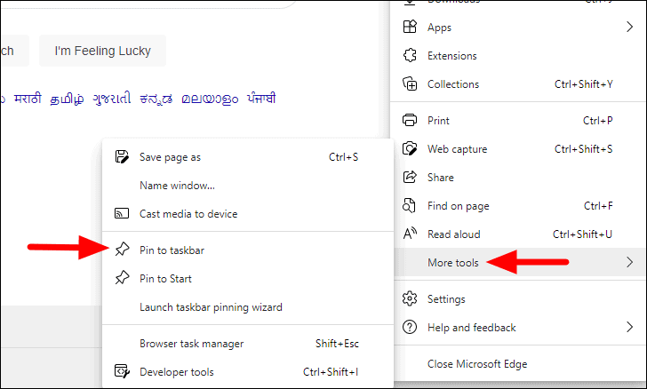 Next, hover the cursor over ‘More tools’, and then click on the ‘Pin to taskbar’ option in that menu that appears.