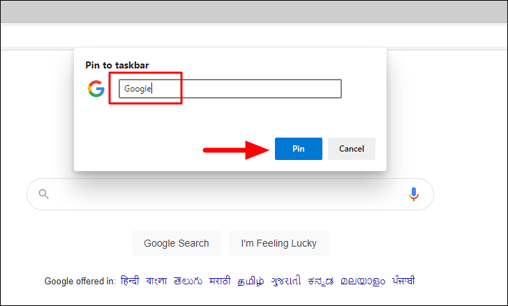 The ‘Pin to taskbar’ box will appear at the top of the tab. The name of the shortcut will be mentioned in the text box, and you also have the option to change it. Once done, click on the ‘Pin’ option.