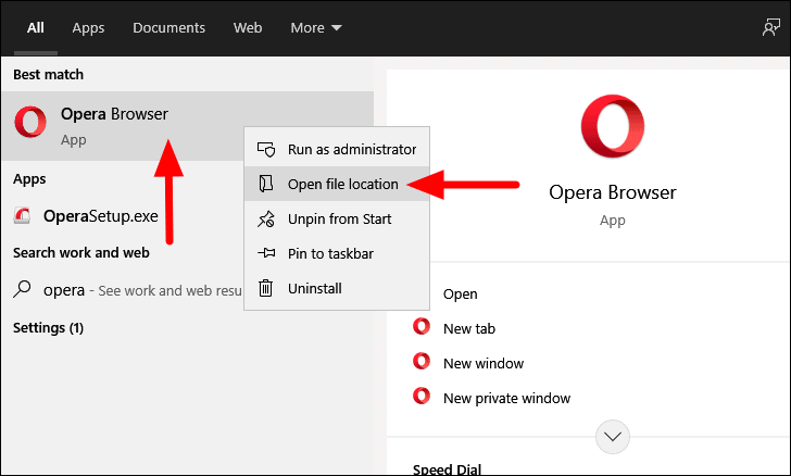 To add a website to the Taskbar with Opera browser, search for the browser in the ‘Start Menu’, right-click on the search result, and then select ‘Open file location’ from the menu.