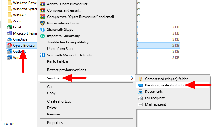 The ‘File Explorer’ window will launch with the ‘Opera Browser’ shortcut selected. Right-click on it, hover the cursor over ‘Send to’, and then select the ‘Desktop (create shortcut)’ option.