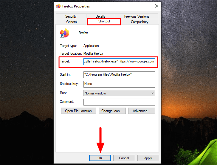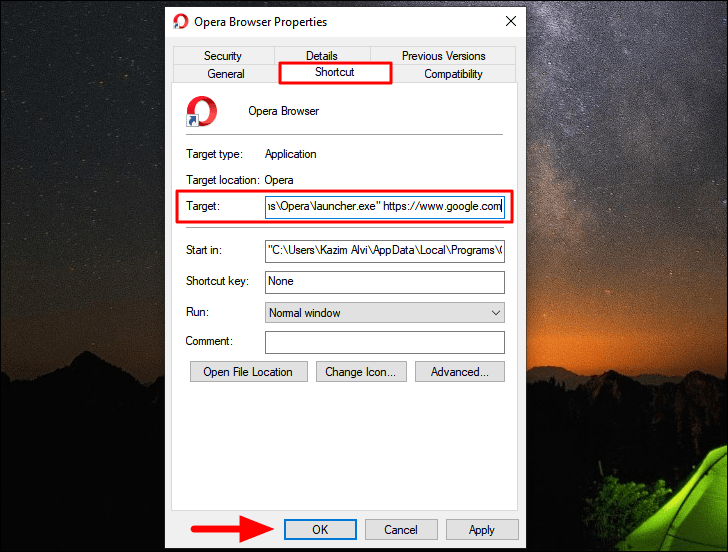 You can similarly add the address for the website that you want to add. However, you must ensure that the address already mentioned in the ‘Target’ section is not altered in any manner and that the URL is just an addition to it. Finally, click on ‘OK’ at the bottom.
