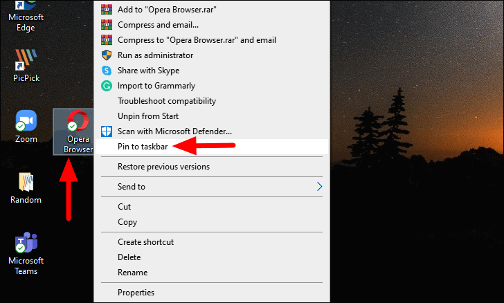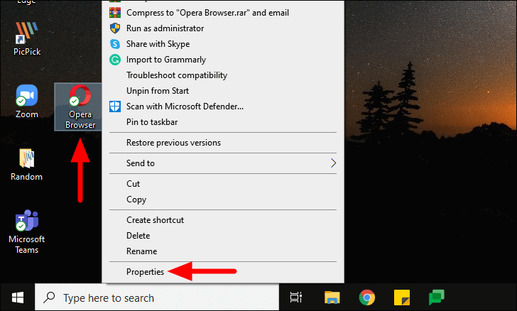An ‘Opera Browser’ shortcut will be added to the Desktop. Right-click on it and select ‘Properties’ from the context menu.