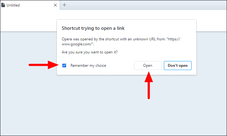 When you launch the added website from the Taskbar the first time, a pop-up will appear at the top asking if you want to continue. Tick the checkbox for ‘Remember my choice’ and then click on ‘Open’, to ensure that it does not appear the next time you add a website.
