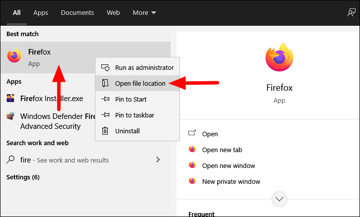 To add a website to the Taskbar with Firefox, search for ‘Firefox’ in the ‘Start Menu’, right-click on the search result, and then select ‘Open file location’ from the menu.