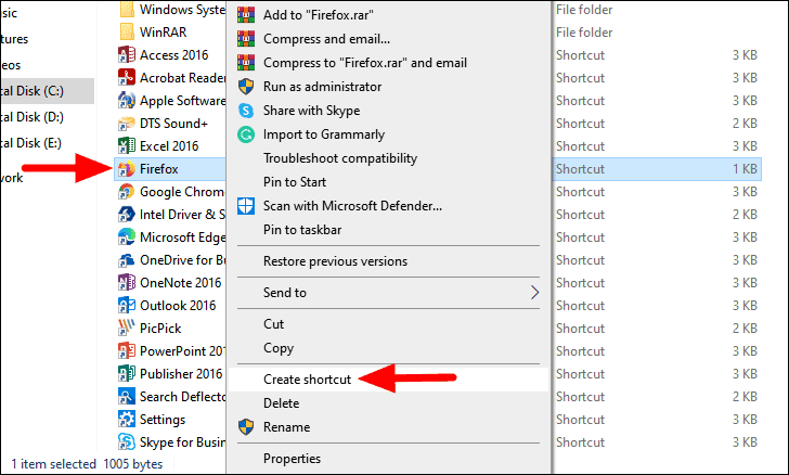 The File Explorer window will now launch with the ‘Firefox’ shortcut selected by default. Right-click on it and then select ‘Create shortcut’ from the context menu.