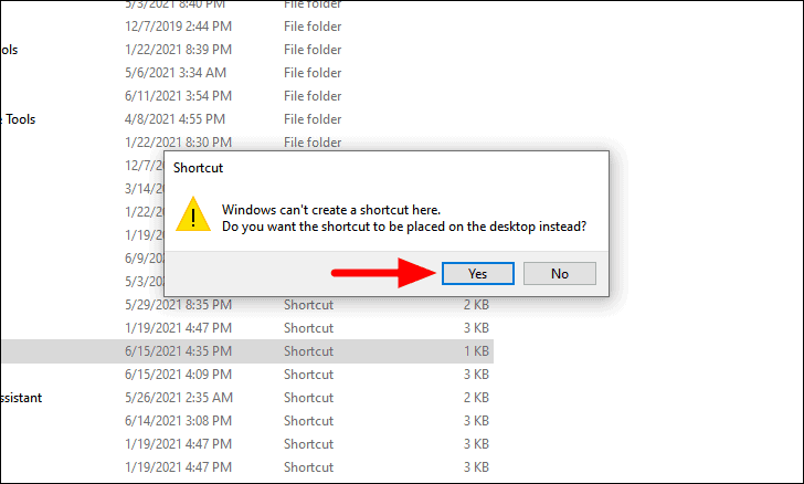 A dialog box will pop up informing that the shortcut cannot be created in this location and if you want to create it on the Desktop. Click ‘Yes’ to continue.