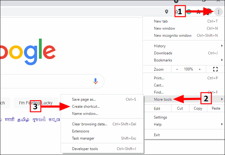 To add a website to the ‘Taskbar’ with Google Chrome, navigate to the website that you want to add. Next, click on the ellipsis near the top-right corner, hover the cursor over ‘More tools’ in the drop-down menu, and then select ‘Create shortcut’ from the menu that appears.