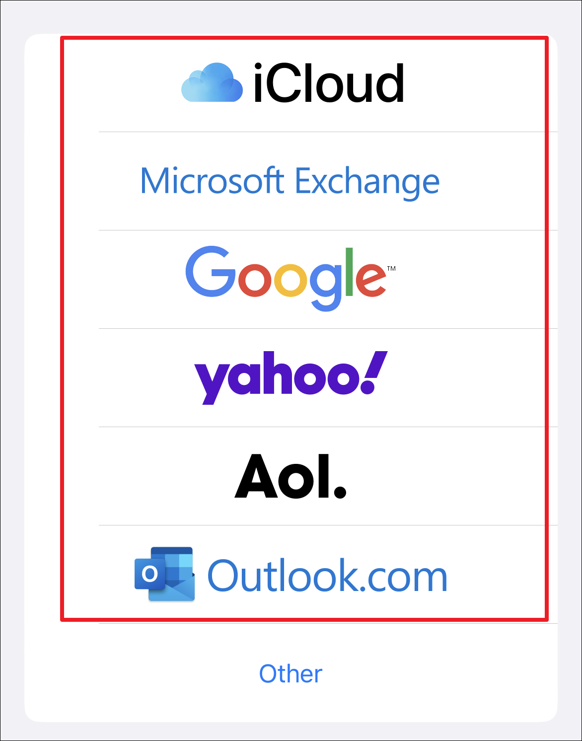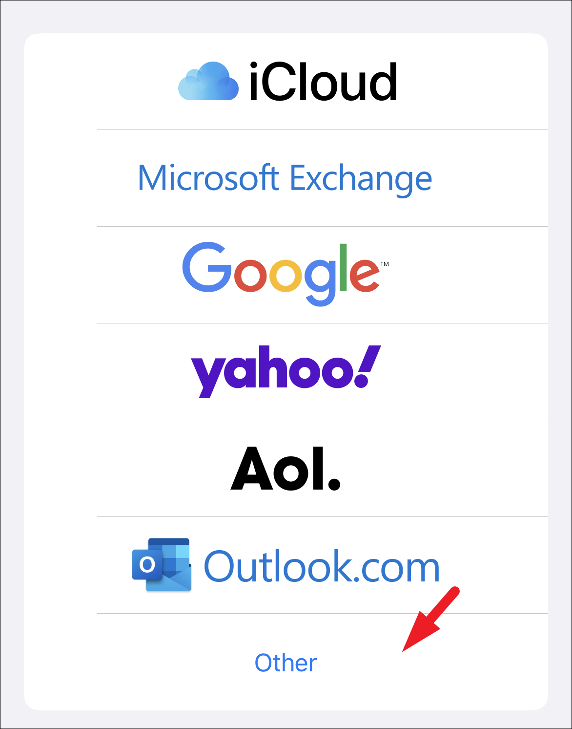 To add an IMAP/POP3 account in the Mail app, tap on the ‘Other’ option when selecting the webmail provider.
