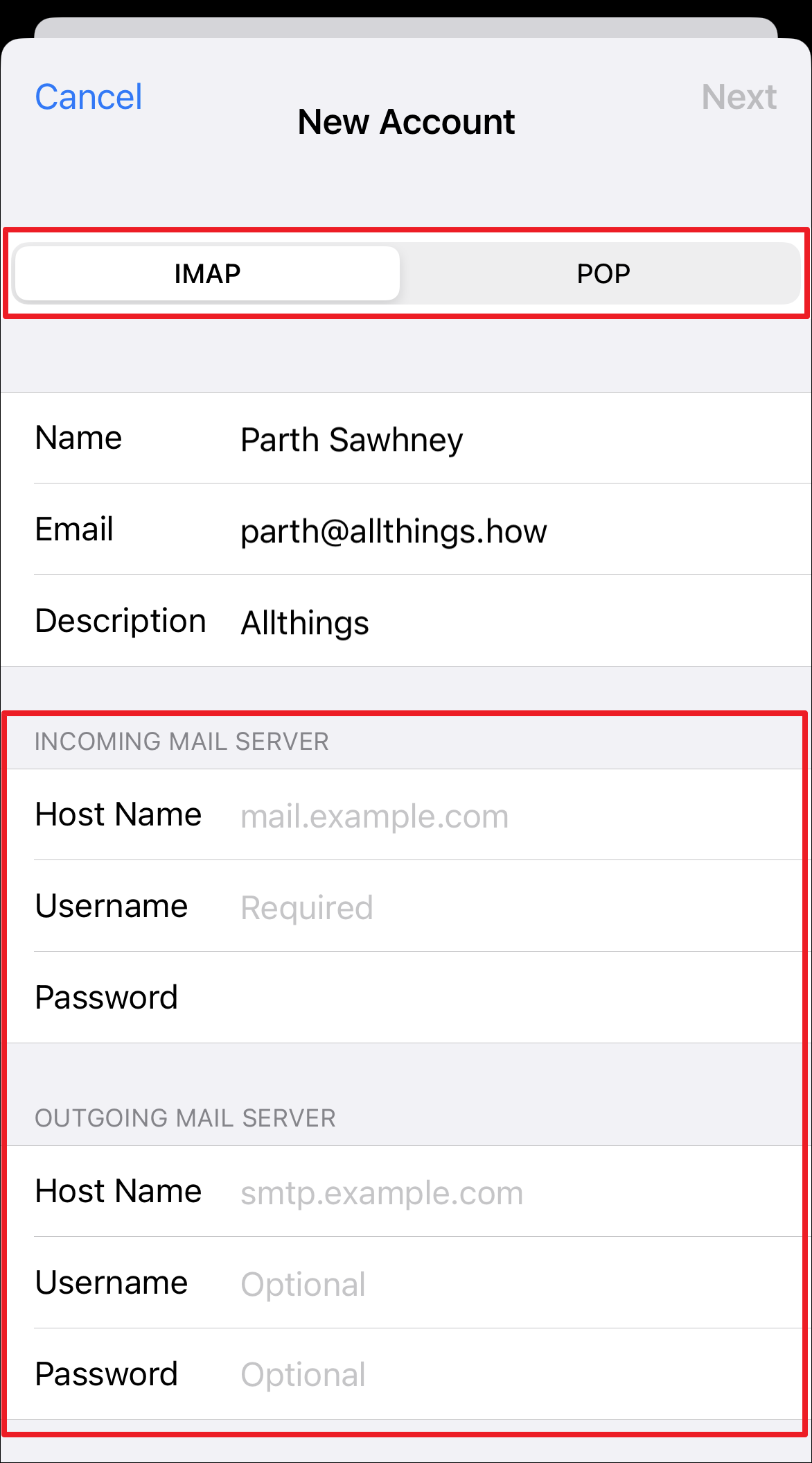 Select the option for IMAP or POP based on your account settings. If you’re not sure which to choose, you’ll need to contact your email provider. Then, enter the details of the ‘Incoming mail server’ and ‘Outgoing mail server’ and tap on the ‘Next’ button.