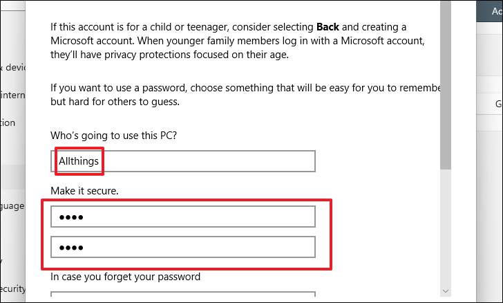 Step 5: Enter the username, password, and password hint for the new account. Click Next to create the account.