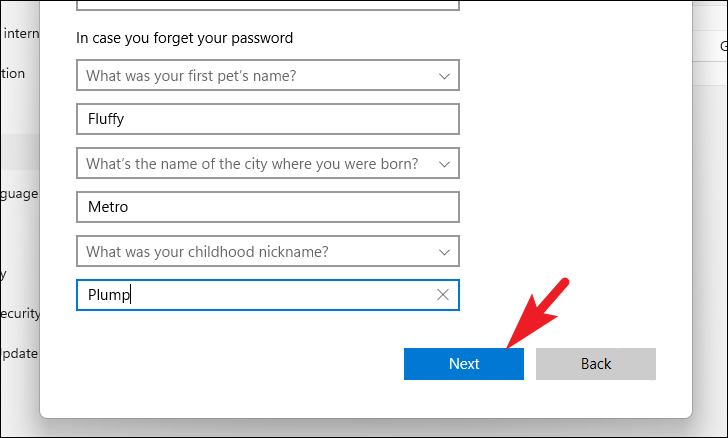 Step 8: Choose security questions from the dropdown menus and provide answers. These questions will help you recover the account if you forget the password. Click Next to create the account.