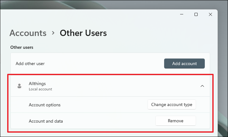 Once completed, the new local user account will appear under the Other users section.