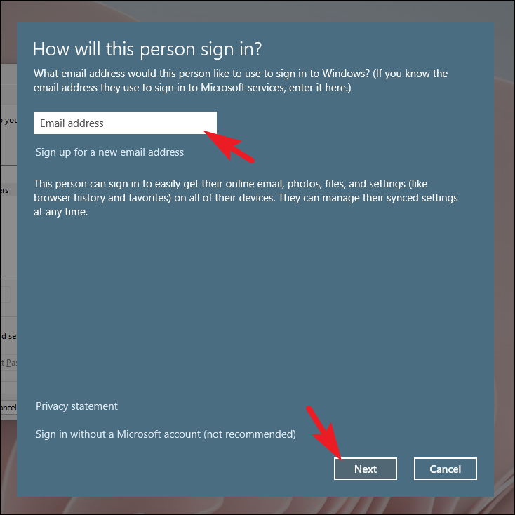 Step 3: Enter the user's Microsoft email address and click Next.