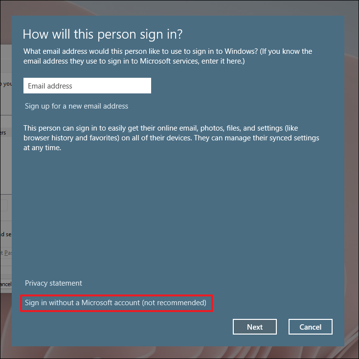 Step 6: On the next screen, select Add a user without a Microsoft account.