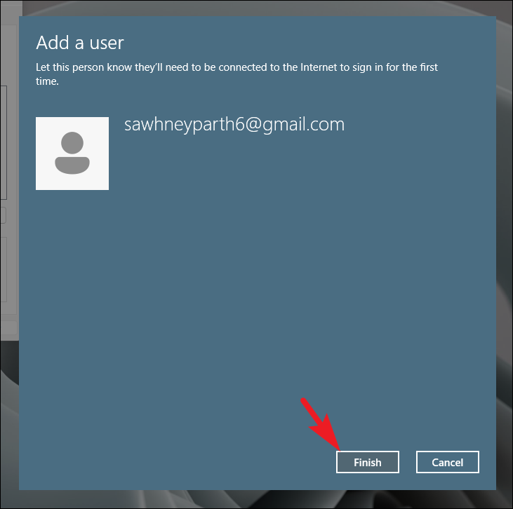 Step 6: If the email is associated with a Microsoft account, click Finish to complete the process. The new user will need an internet connection the first time they sign in.