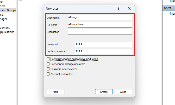 Step 4: Fill in the username, full name, and password fields. You can set password options such as requiring the user to change the password at next logon or preventing them from changing it. Click Create when done.