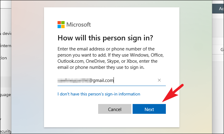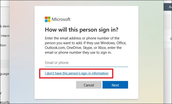 Step 5: Instead of entering an email, click on I don't have this person's sign-in information.
