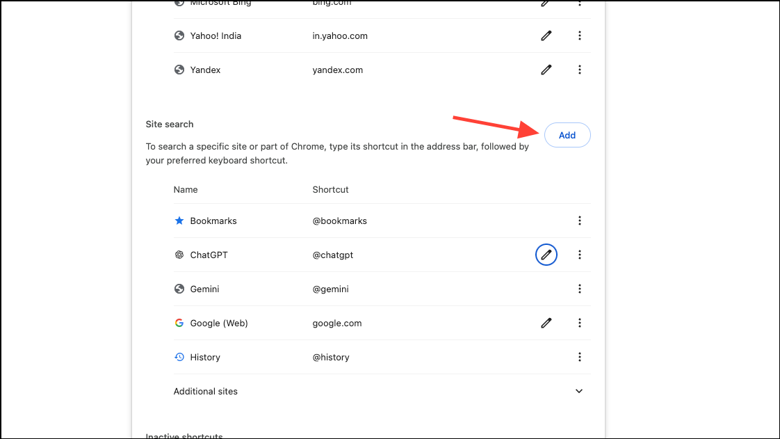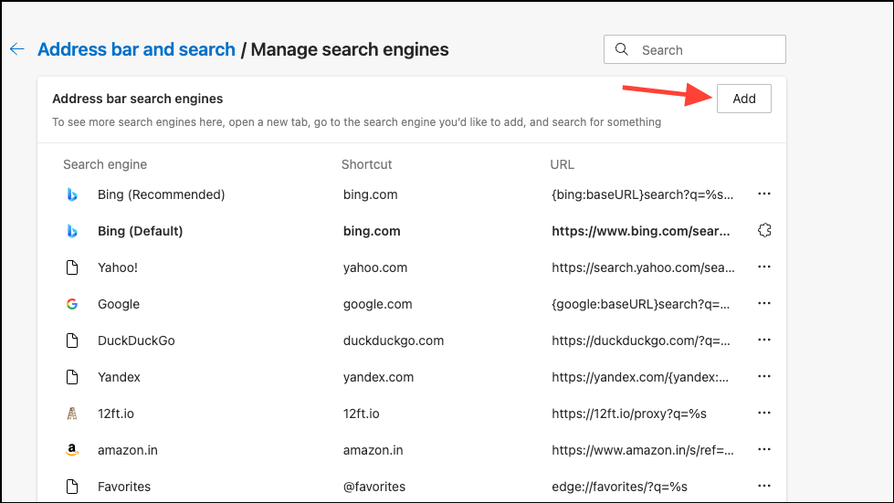 - Then, scroll down and click on 'Add' under the Search shortcuts option. (Without the previous configuration, you won't get this Add option).