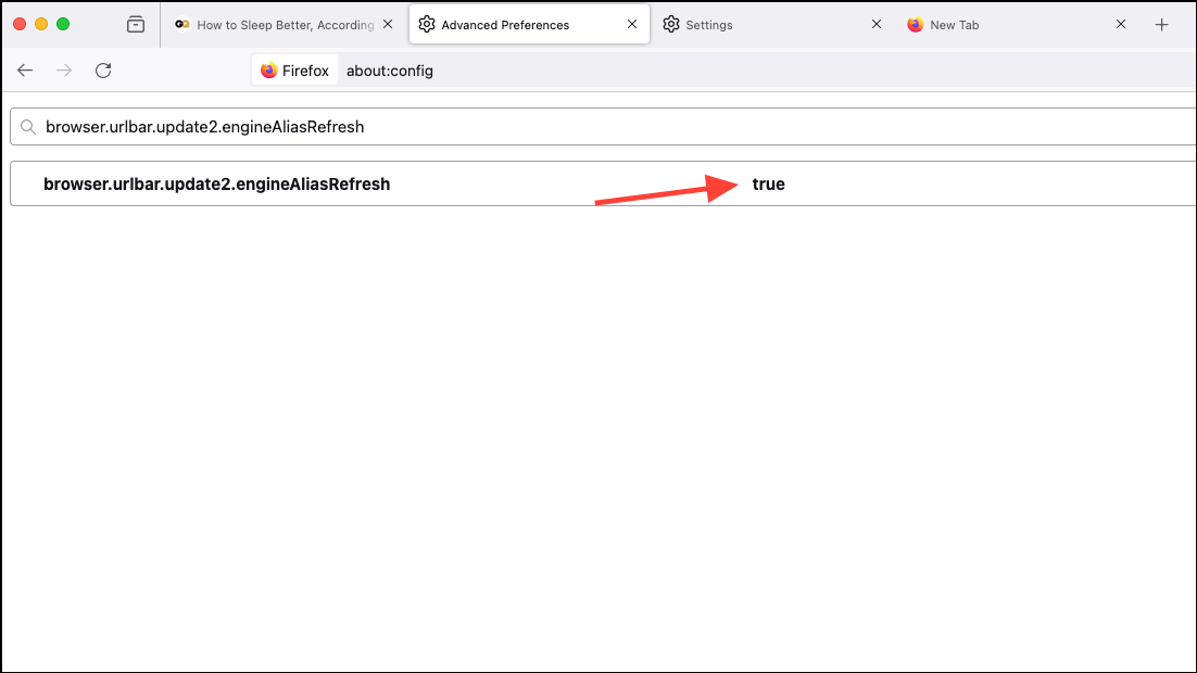 browser.urlbar.update2.engineAliasRefreshin the address box. Click '+' on the right side of the variable. - It should look like this after clicking '+'.