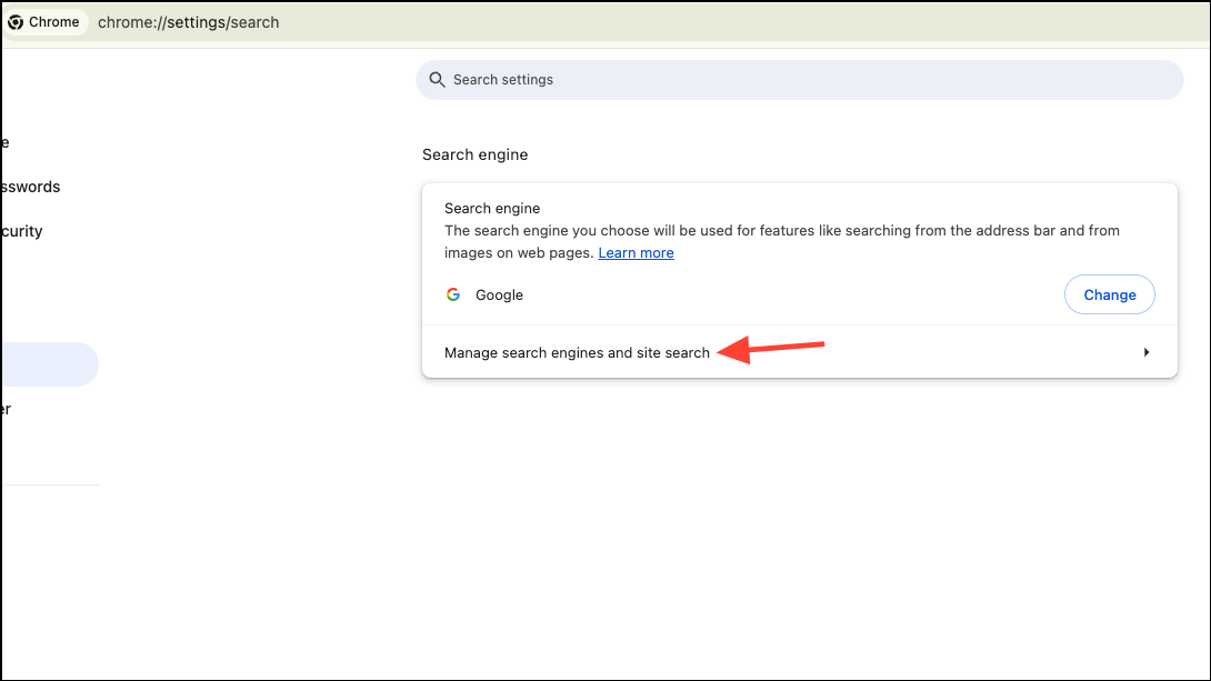 - Click on 'Manage search engines and site search'.