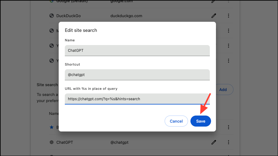 However, adding ChatGPT as the default search engine might be a too far-fetched idea for some right now. Instead, if you want the comfort of accessing ChatGPT search from your browser's address bar without replacing your current default search engine, consider adding it as a custom search engine.