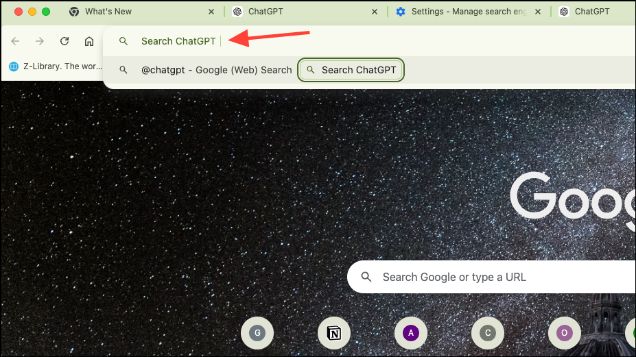 Now, in your browser, when you want to use ChatGPT search instead of your default search engine, start typing @chatgpt and press 'Tab' before entering your query.