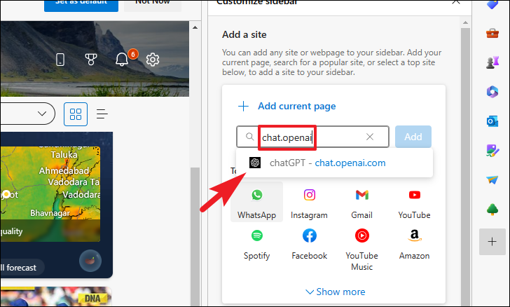 Step 2: In the sidebar that appears, enter chat.openai.com into the search bar. When the 'ChatGPT' option shows up below, click on it to select it.