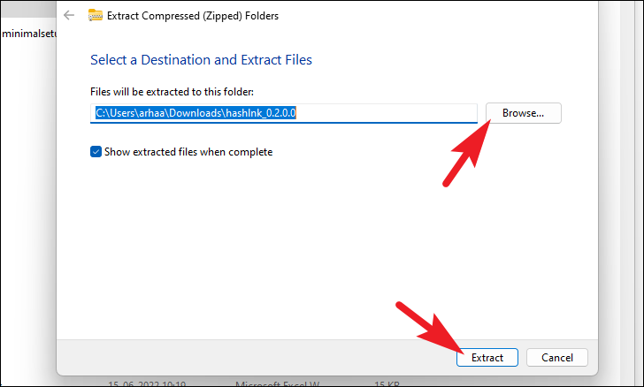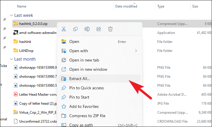 Step 2: Once the download is complete, navigate to the folder where you saved the zip file. Right-click on hashlnk_xxx.zip and select 'Extract all' from the context menu to open the extraction wizard.
