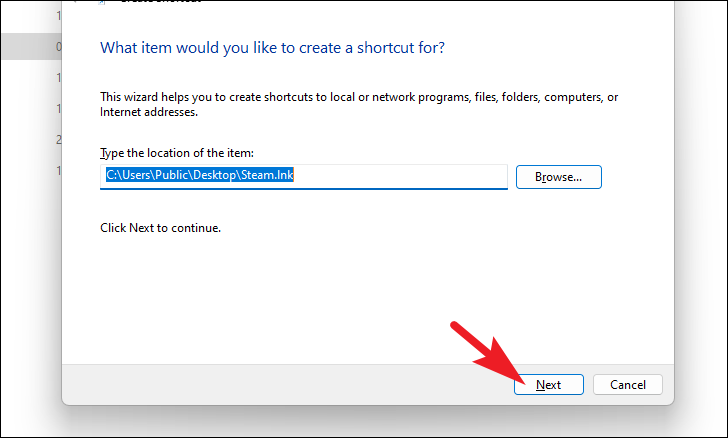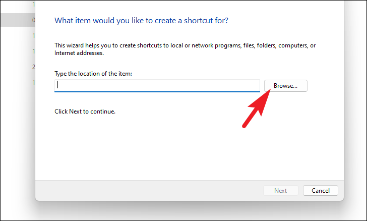 Step 9: In the 'Create Shortcut' window that appears, click 'Browse' to locate the app, file, or folder you want to add to the Win+X menu.