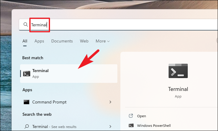 Step 14: Open the Start menu, type Terminal in the search bar, and click on the 'Terminal' app to launch it.