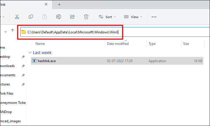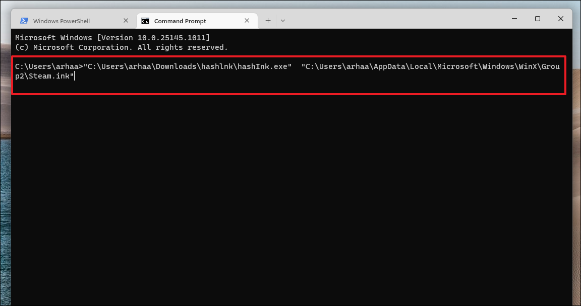 "C:\Users\YourUsername\Downloads\hashlnk\hashlnk.exe" "C:\Users\YourUsername\AppData\Local\Microsoft\Windows\WinX\Group2\YourShortcut.lnk"