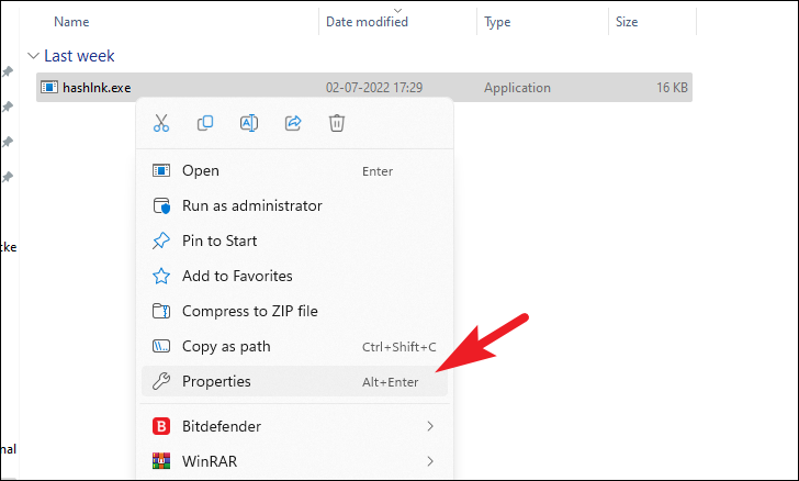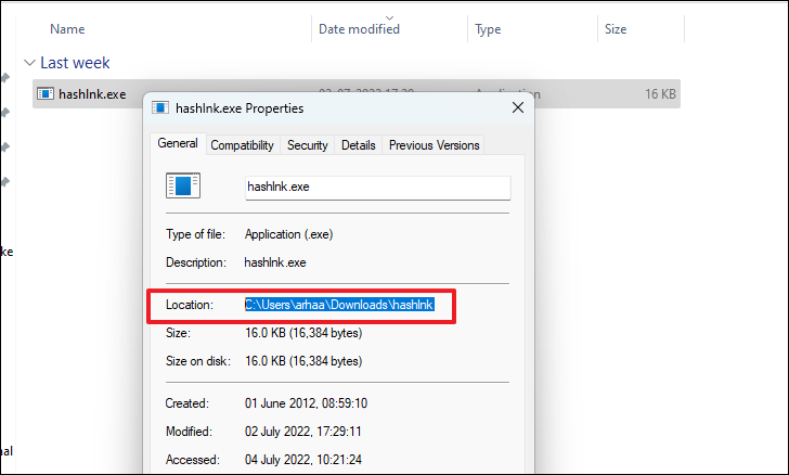 Step 4: After extraction, locate the hashlnk.exe file in the unzipped folder. Right-click on it and select 'Properties' to open the file's properties window.