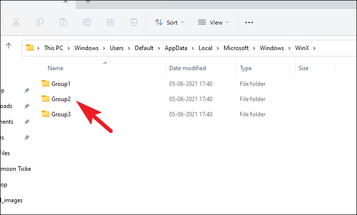 Step 7: Within the WinX folder, you'll see three group folders: 'Group1', 'Group2', and 'Group3'. These correspond to different sections of the Win+X menu. Open the group folder where you want your custom shortcut to appear. 'Group1' represents the bottom section, 'Group2' is the middle, and 'Group3' is the top.