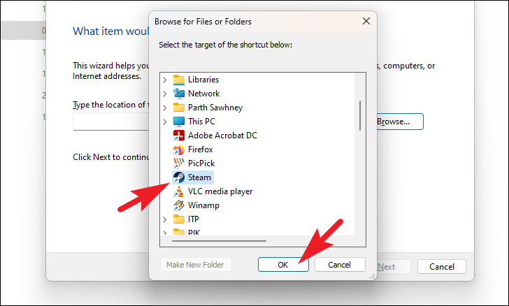 Step 10: Navigate to the item you wish to add, select it, and click 'OK'. This will populate the shortcut's location in the wizard.
