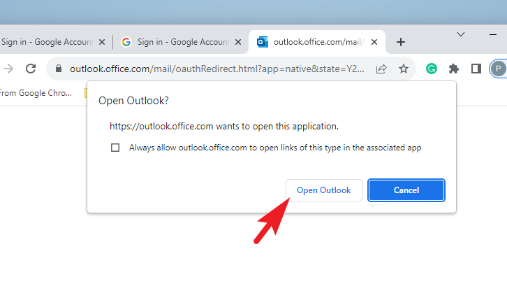 Step 5: You may be asked to grant Outlook access to your Google account. Click 'Allow' to provide the necessary permissions. After granting access, an alert will appear on your screen.