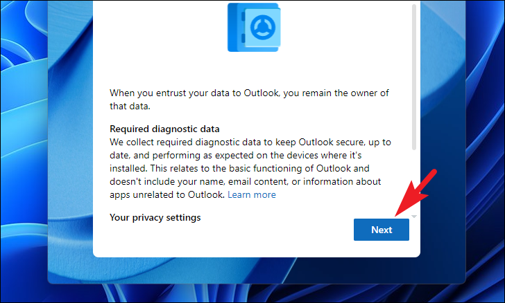 Step 7: Back in Outlook, wait a moment as the app sets up your Gmail account. Once the setup is complete, click 'Next' to proceed.