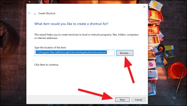 Step 2: In the 'Create Shortcut' window that appears, click on the 'Browse' button to locate the Google Chrome application file.