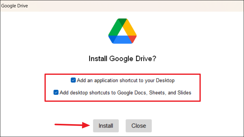 Step 3: During the installation, you can choose to add shortcuts to Google Drive and Google's online office apps on your desktop. Select the options that suit your preference and click 'Install' to proceed.
