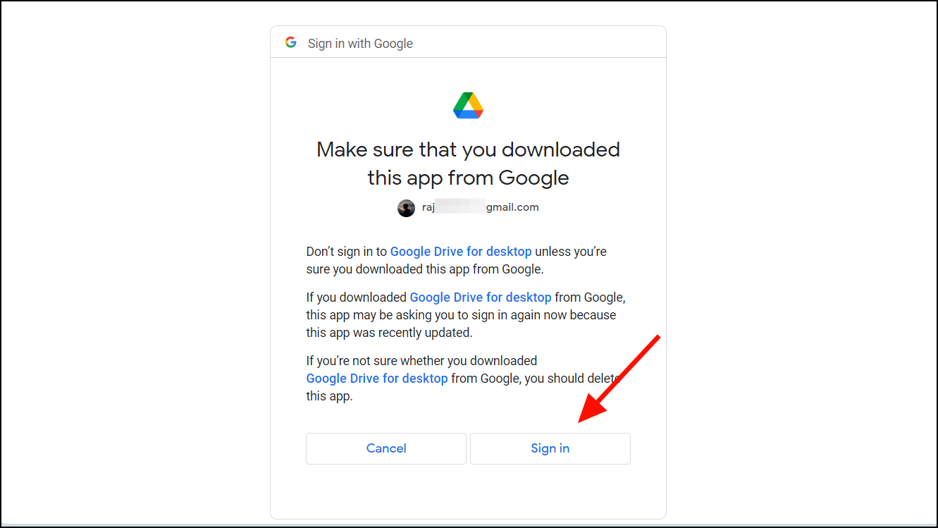 Step 8: Grant the necessary permissions by clicking 'Sign in' on the consent screen. This allows the app to access your Google Drive files.