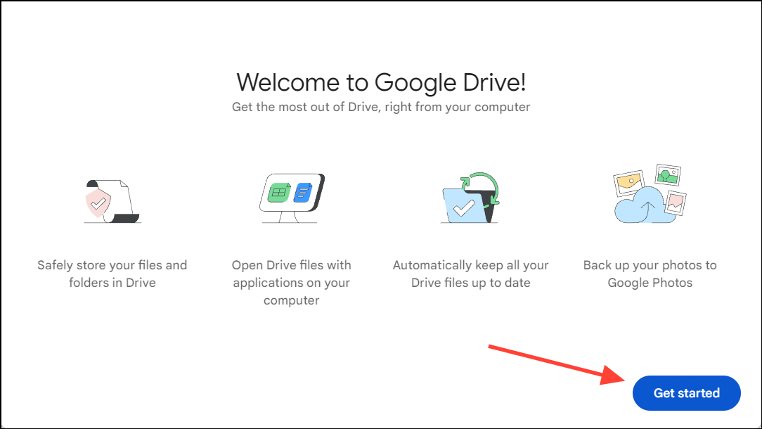 Step 5: In the Google Drive app window, click on 'Get started' to begin the setup process.