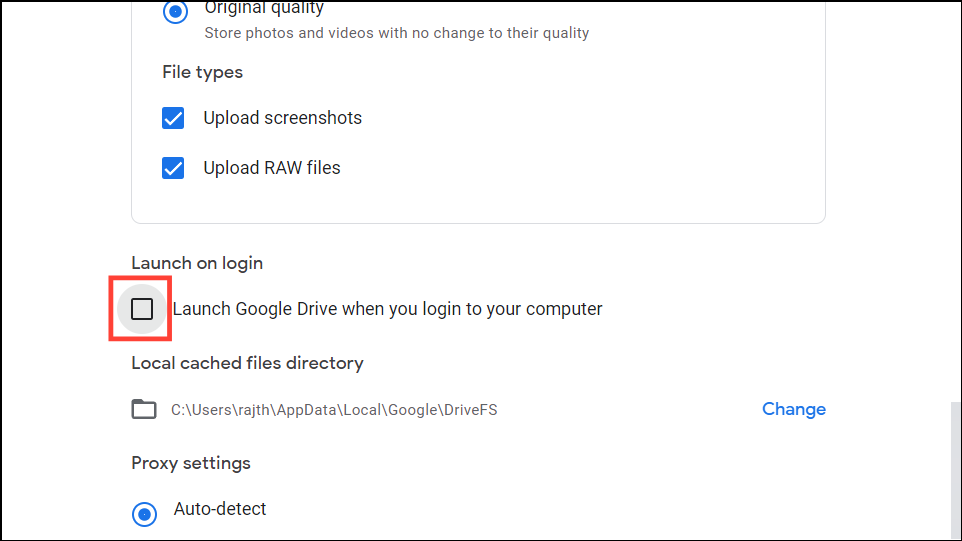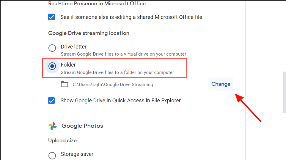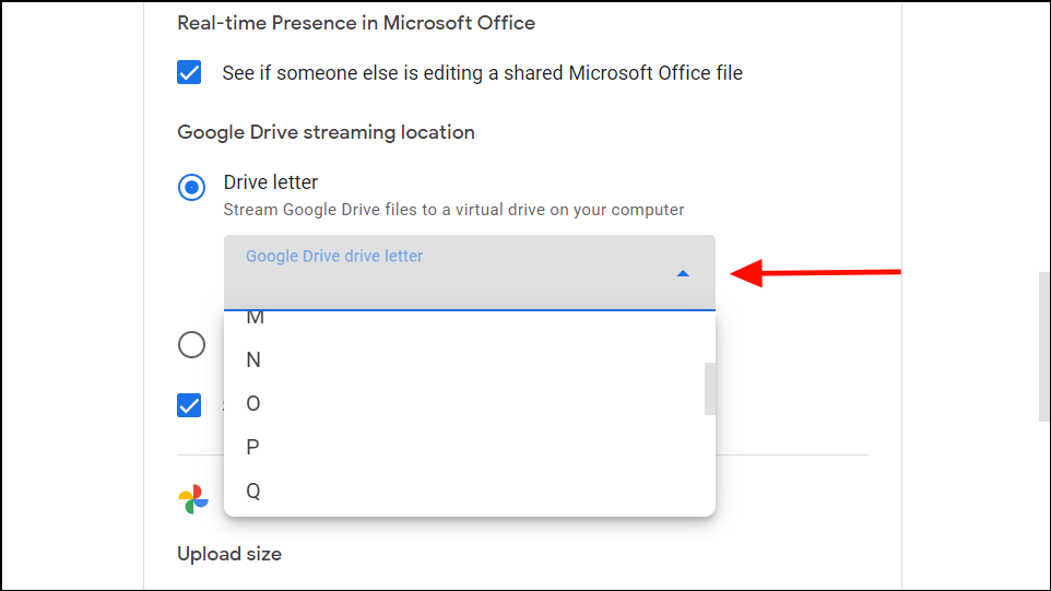 For example, to assign a different drive letter to Google Drive, select your preferred letter from the 'Drive letter' dropdown menu.
