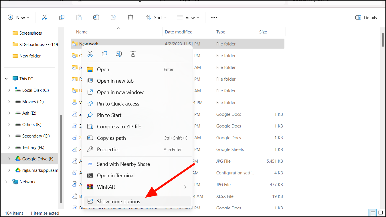 Step 1: In File Explorer, right-click on 'Google Drive' and choose 'Show more options' to access the classic context menu.