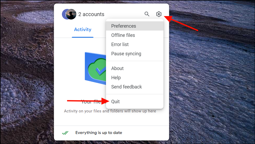 Step 2: To temporarily remove Google Drive, click the Google Drive icon, then click the settings cog and select 'Quit'. This will stop the app from running until you start it again.