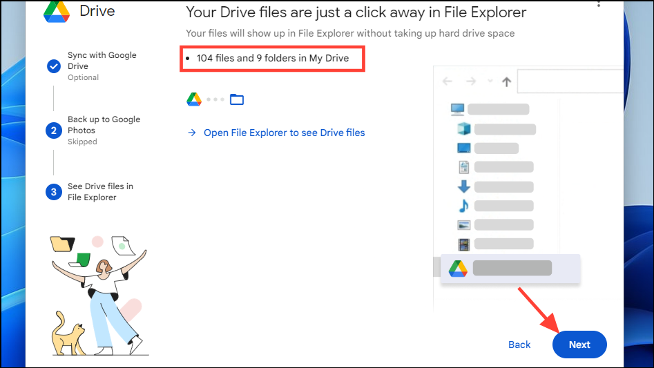 Step 9: Google Drive will display the files and folders that will appear in File Explorer without taking up space on your computer. Review the list and click 'Next' to proceed.